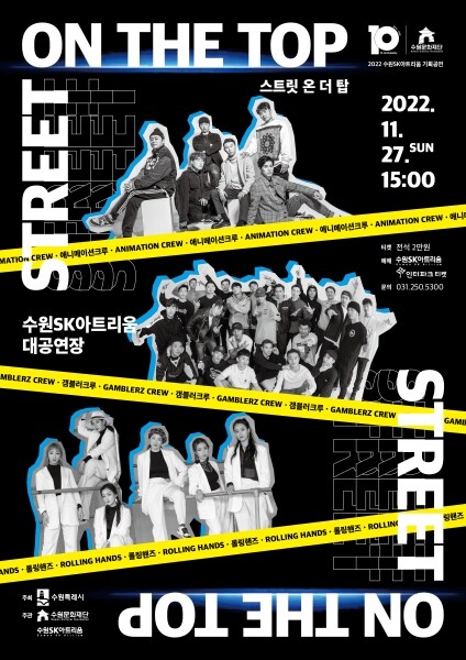 공연부 멘트 최근 종영한 서바이벌 예능 프로그램인 Mnet ‘스트릿 우먼 파이터’, JTBC ‘쇼다운’ 등 스트릿 댄스에 대한 대중적인 관심과 열풍을 이어 나갈 수원SK아트리움의 개관 이래 첫 비보잉 기획공연이다.