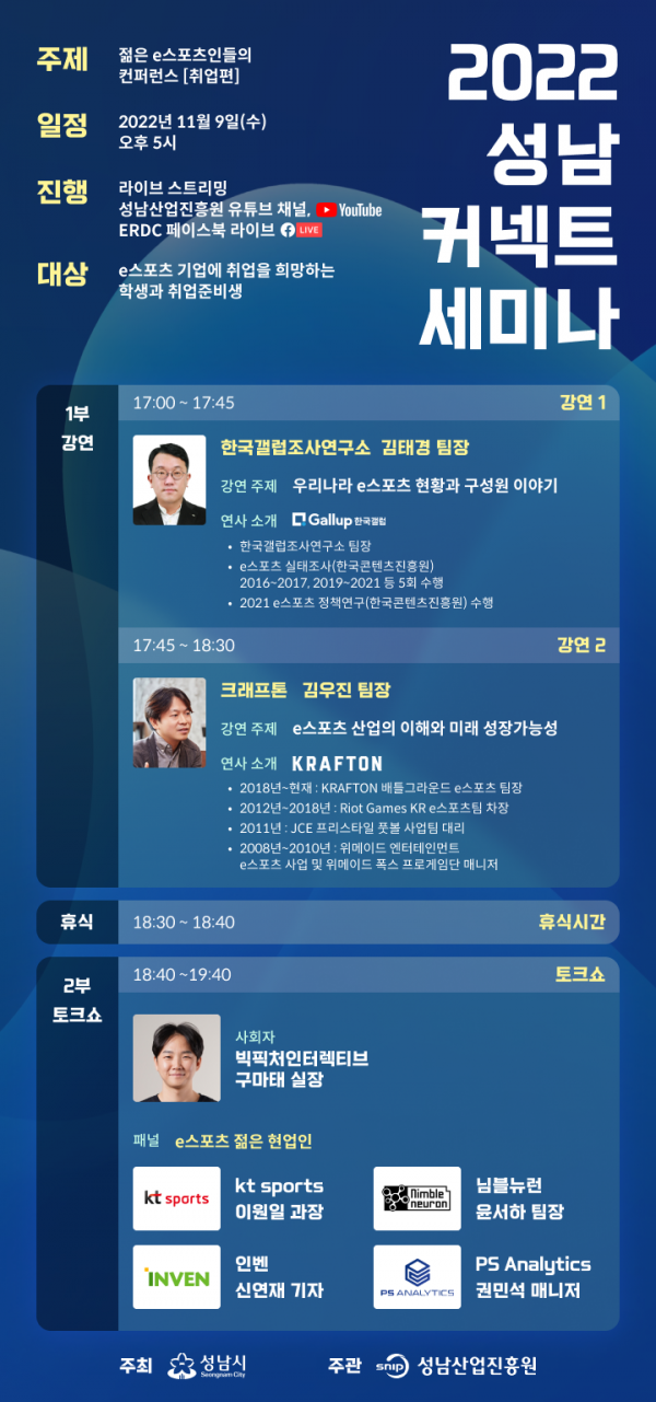 성남시가 주최하고 성남산업진흥원이 주관하는 ‘2022 성남 커넥트 세미나’는 e스포츠 기업에 취업을 희망하는 학생 및 취업준비생을 대상으로 ‘젊은 e스포츠인들의 컨퍼런스’를 주제로 해 두 개의 전문가 강연과 하나의 토크쇼로 진행된다.