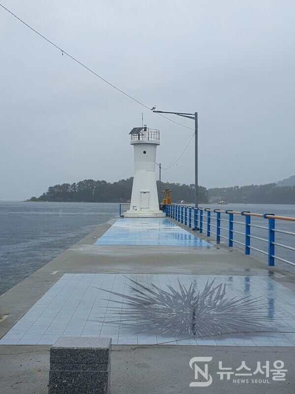 사진은 비 내리는 거제 사등면 성포항 방파제와 등대 모습이다.