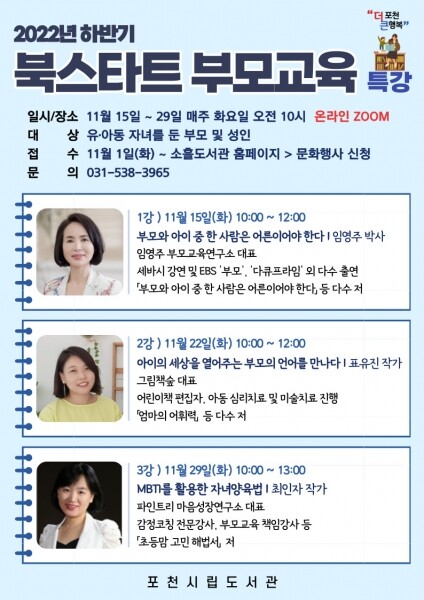 29일에는 ‘MBTI를 활용한 자녀양육법’이라는 주제로 파인트리 마음성장연구소 대표인 최인자 작가가 진행한다.