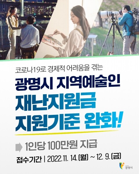 다만 이미 지급받은 다른 재난지원금이 지역예술인 재난지원금보다 적을 시 차액분은 신청 가능하며 구체적인 자격요건 및 방법 등 자세한 사항은 광명시 누리집 고시·공고에서 확인 후 신청하면 된다.