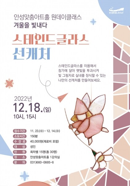 또한 12월 18일 오전 10시와 오후 3시, 두 차례 진행될 ‘스테인드글라스 선캐처’ 원데이클래스는 성인 대상 프로그램으로 스테인드글라스를 이용해 나만의 인테리어 소품을 만드는 프로그램이다.