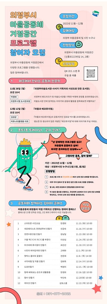 또한 거점공간 이용과 비대면 활동을 결합시킨 기획프로그램 ‘홈트, 같이 할래?’와 다양한 재능을 가진 마을공동체의 특성을 살려 ‘공동체와 함께하는 원데이클라스’를 12월까지 매주 진행할 예정이다.