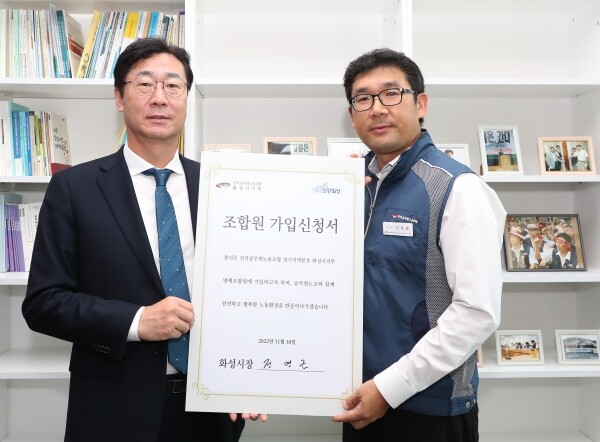 정 시장은 이날 화성시청 본관 1층에 마련된 공무원 노조 사무실에서 열린 ‘공무원노조 사무실 정비공사 개소식’에 참석해 “공무원노조와 함께 건강하고 안전한 노동환경을 만들어 나가겠다”며 명예회원으로 가입했다.