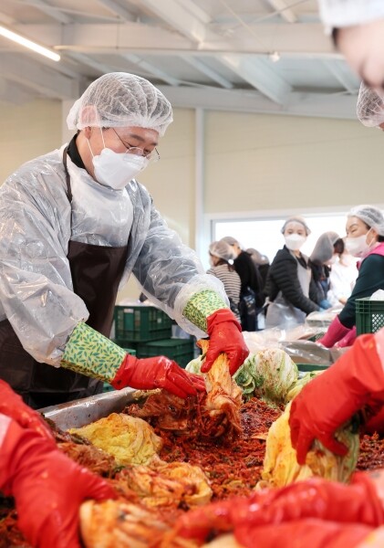 이상일 용인특례시장과 자원봉사자들이 담근 김치는 각 읍면동의 홀로 어르신, 장애인 등 취약계층 500가구에 10kg씩 전달될 예정이다.