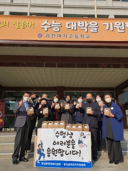 성영주 과천시 중앙동장은 “코로나19 장기화로 힘든 상황 속에서 열심히 수능을 준비해온 학생들을 격려하고 응원하기 위해 응원물품을 준비했다 수험생들이 최선을 다해 좋은 결과를 얻을 수 있기를 바란다”고 말했다.