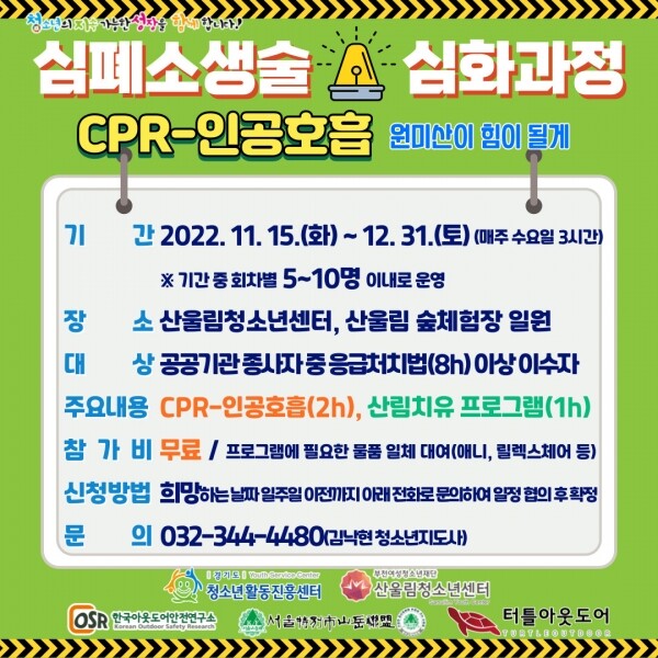이번 프로그램은 청소년과 지역주민, 소방·경찰 공무원을 위한 산림치유 프로그램 청소년수련시설과 공공기관 종사자를 위한 심폐소생술 심화과정 등 두 가지 활동으로 운영된다.