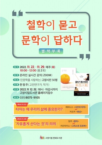 프로그램은 11월 22일 부터 11월 29일까지 매주 화요일 오전 10시~12시에 진행되며 인문학에 관심이 있는 시민이라면 누구나 참여할 수 있다.