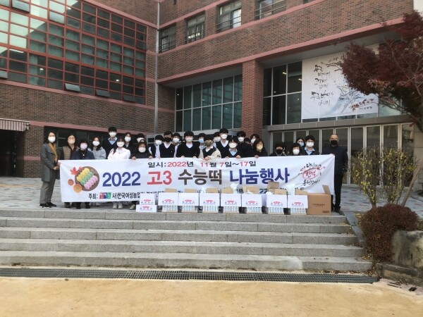 [뉴스서울] 한국여성농업인 김포시연합회는 지난 11일 사우동 소재 사우고등학교를 방문, 고3 수험생 340명의 얼마 남지 않은 수능 시험을 응원하기 위해 김포금쌀로 빚은 찹쌀떡과 음료수, 방역마스크 등을 배부하며 크게 격려했다.