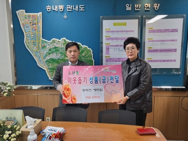 이날 기탁된 성금은 사회복지공동모금회를 통해 송내동에 거주하는 취약계층 및 복지 사각지대에 놓인 가구를 위해 사용될 계획이라고 전했다.