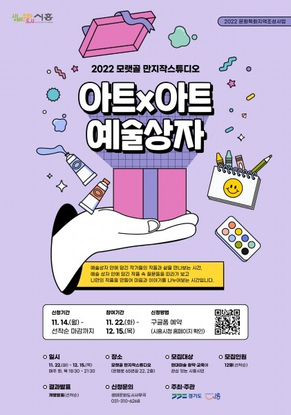 이번 모랫골 만지작스튜디오 시민-예술가 창작프로그램 ‘아트x아트, 예술상자’는 오는 11월 22일부터 12월 15일까지 매주 화요일과 목요일 모랫골 만지작 스튜디오에서 오후 6시 30분에서 오후 9시 30분까지 진행된다.