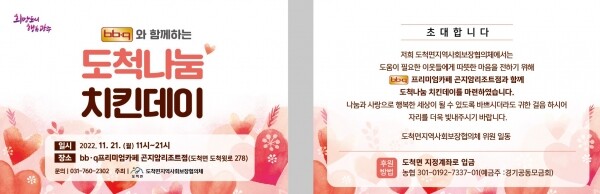 이번 행사는 지역사회 복지 문제해결을 위한 나눔의 장을 만들고 함께 살아가는 복지공동체 사회 분위기를 조성하기 위해 bb·q 프리미엄카페 곤지암리조트점과 도척면 지역사회보장협의체가 마련했다.