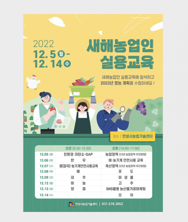 ‘2023년 새해농업인 실용교육’은 안성시 농업기술센터 비봉관에서 총 15개의 농업과정으로 진행된다.