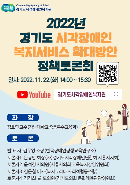 이번 토론회는 한국장애인평생교육연구소 김두영 소장의 ‘경기도 시각장애인 복지서비스 확대 방안’이라는 주제 발표에 이어 좌장으로 김호연 강남대학교 중등특수교육과 교수가 참여한 가운데 윤석경 시의원 김경희 前 도의원 문광만 회장경기도시각장애인연합회 시흥시지회 김은철 이사가 토론자로 참석할 계획이라고 전했다.