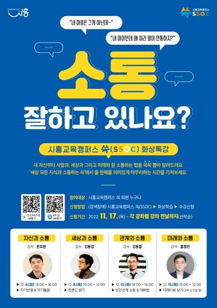 강좌는 온라인 학습공간 ‘시흥교육캠퍼스 쏙’에서 4개 소통 분야별 실시간 화상학습 방식으로 열린다.