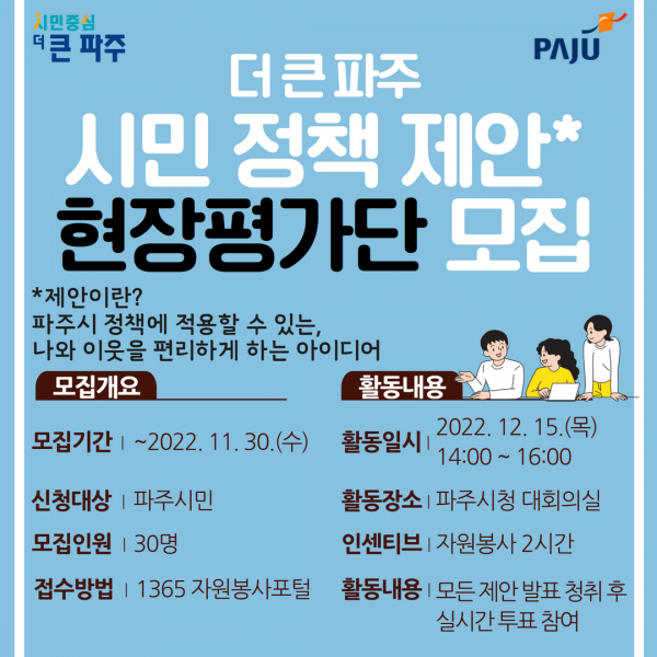 현장평가단 신청 방법은 1365 자원봉사포털 접속 후 봉사지역을 파주시로 설정하거나 ‘현장평가단’으로 검색해 신청하면 되고 자세한 사항은 기획예산과 성과관리팀으로 문의하면 된다.