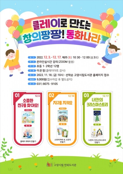 이 프로그램은 초등 1~2학년 12명을 대상으로 12월 3일부터 17일까지 매주 토요일 오전 10시 30분부터 12시까지 진행하며 강의는 이은정 클레이아트 강사가 맡는다.