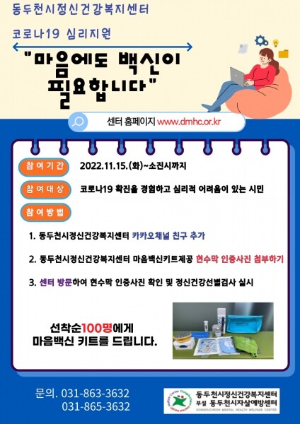참여 방법은 ‘동두천시정신건강복지센터 카카오채널 친구 추가하기’, 관내 게시된 해당 이벤트 ‘현수막 사진 촬영하기’, 센터 내소 또는 온라인을 통해 ‘정신건강 선별검사 실시하기’ 등이며 센터를 방문해 캠페인 참여를 인증한 선착순 100명에게 마음백신키트를 제공한다.