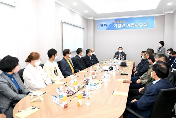 김경일 파주시장은 “사무실에서 들을 수 없었던 현장의 목소리를 듣기 위해 직접 찾아뵙게 됐다”며 “기업의 요청과 제안사항에 대해 충분히 검토해 기업지원 정책에 반영될 수 있도록 노력하겠으며 앞으로 기업인 이동 시장실을 주기적으로 열어 기업인들이 경영에만 전념할 수 있도록 최선을 다하겠다”고 말했다.