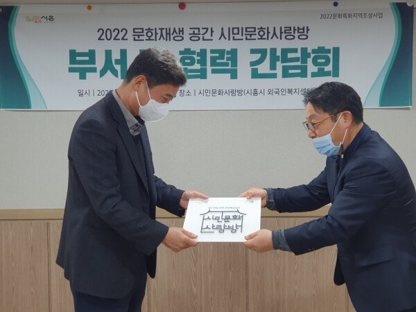 17일 ‘시민문화사랑방’에서 열린 문화예술과-외국인주민과 협력 간담회에서는 ‘시민문화사랑방’ 현판을 전달하고 공간 안전점검과 향후 활성화 방안을 논의하는 자리가 마련됐다.