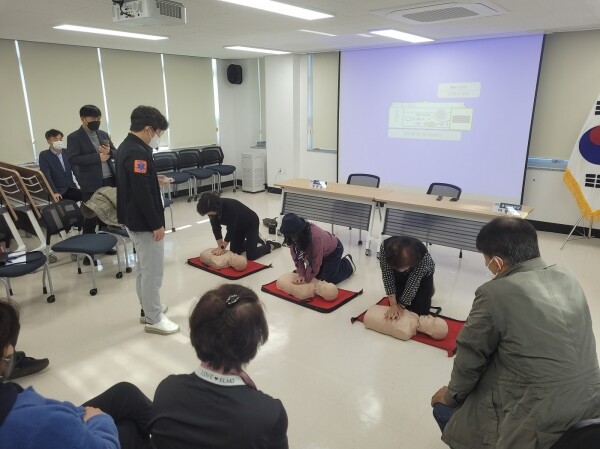 교육은 응급 상황 발생 및 처치 영상 시청, 마네킹을 활용한 심폐소생술 실습, 응급상황 발생 시 주의사항 및 행동요령 등 체험 위주로 진행됐다.