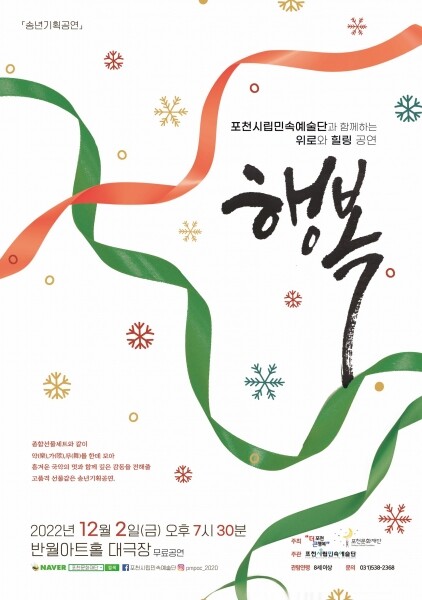악, 가, 무를 한데 모아 구성한 이번 공연 ‘행복’은 종묘제례악과 종묘제례일무 중 ‘전폐희문’ 궁중정재무인 아박무 앉은반 설장고와 사물놀이 남도민요와 입춤 포천시립민속예술단의 색을 입힌 창작국악곡 ‘날개’, ‘바람 위를 걷다’, ‘한탄강 사랑가’를 국악연주로 표현했다.