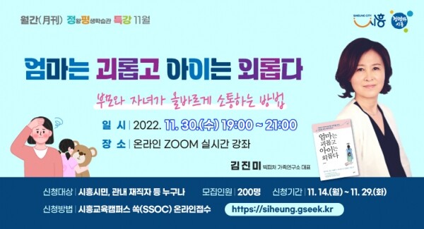 특강은 30일 저녁 7시부터 9시까지 진행되며 신청은 시흥교육캠퍼스 ‘쏙’ 누리집 또는 모바일 앱을 통해 무료로 신청할 수 있다.