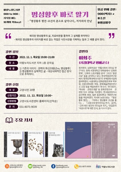 ‘명성황후 바로 알기’는 ‘000 to 900’ 기획의 여덟 번째 강연으로 한국십진분류표상 900번대 ‘역사’ 분야의 강연이다.