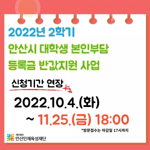 이세영 교육청소년과장은 "더 많은 안산 거주 대학생들이 교육비 경감 혜택을 누릴 수 있도록 신청기간을 연장했다"며 “아직 신청하지 않은 학생들의 경우 연장된 신청기간 내 꼭 접수해달라”고 말했다.