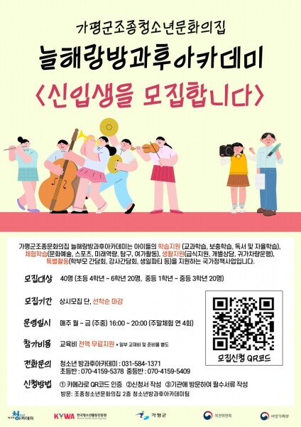 늘해랑청소년방과후아카데미는 2개의 반 ‘소담반과 도담반’ 으로 나뉘어 운영되며 소속 청소년들에게는 ‘국어, 영어, 수학 교과학습’ ‘문화·예술, 스포츠, 4차산업 프로그램’ ‘자격증반 운영’ ‘주말체험학습 운영’ 등 다양한 영역의 프로그램이 지원된다.
