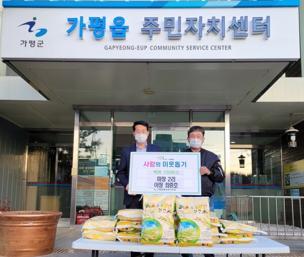 이에 임상호 가평읍장은 “직접 농사지은 쌀로 타인을 위해 나눔의 미학을 보여주신 마장2리 최중호 이장님께 감사의 말씀을 드린다 추워지는 날씨에 관내 경제적으로 힘든 이웃들에게 귀중히 전달하겠다”고 말했다.