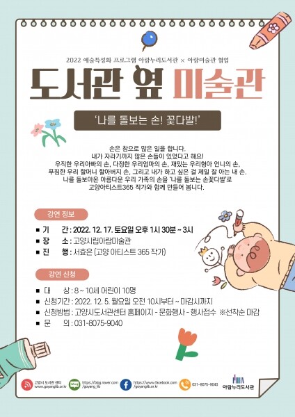 이번 프로그램은 고양아티스트 365 서효은 작가와 함께 12/17 오후 1시 30분~3시에 초등 저학년 대상으로 ‘어디에서든 내자리가 꽃자리’ 12/17 오후 3시 30분~5시 30분에 초등 고학년을 대상으로 ‘나를 돌보는 손 꽃다발’을 진행한다.
