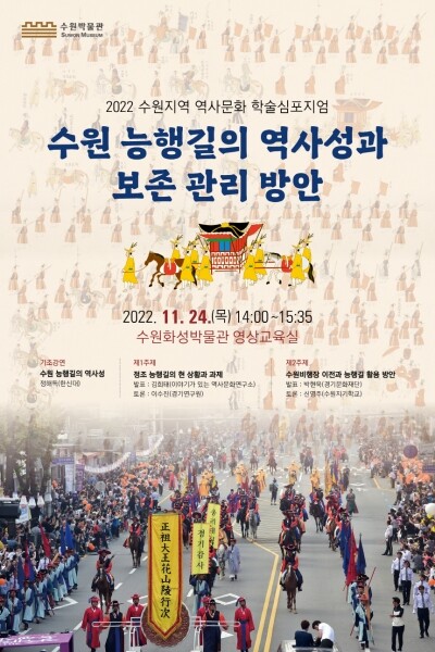 수원박물관은 24일 오후 2시 수원화성박물관 영상교육실에서 ‘수원 능행길의 역사성과 보존 관리 방안’을 주제로 2022 수원지역 역사문화 학술심포지엄을 연다.