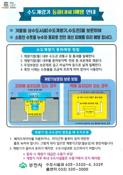 배종규 시 수도시설과장은 “수도계량기나 수도관이 얼었을 때 급작스러운 온도변화는 파손의 원인이 되므로 헤어드라이어를 이용하거나 미지근한 물로 점차적으로 녹일 것”이라며 “동파가 발생했을 때는 부천시 상수도 종합상황실이나 부천시 콜센터로 신속히 신고해 달라”고 말했다.