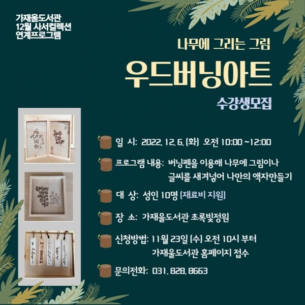 [뉴스서울] 의정부시는 12월 6일 화요일 가재울도서관에서 성인을 대상으로 사서컬렉션 연계프로그램 ‘우드버닝아트 액자만들기’를 운영한다.