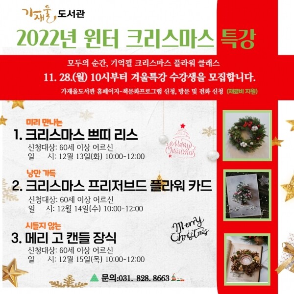 박영애 도서관과장은 “가재울도서관의 ‘2022년 윈터 크리스마스 특강’은 예쁜 것을 보고 만지는 동안 마음이 따뜻해지는 체험활동이니 많이 참여해 주시고 우리 어르신들이 올해뿐만 아니라 항상 건강하시길 바란다”고 밝혔다.