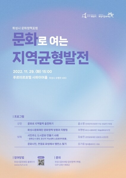 발제로는 화성시문화재단 문화정책 방향과 지향점 시민주도 도시문화 만들기 사례 문화시민, 연결로 화성에서 밸런스 찾기를 주제로 발표한다.
