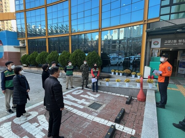 이날 훈련에는 교문2동 직원들과 주민자치센터 수강생, 시립장자어린이집 원생 및 교사, 소방관 등 총 40여명이 참여했다.