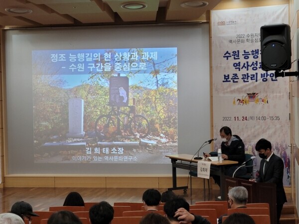 ‘정조 능행길의 현 상황과 과제’를 주제로 발표한 김희태 소장은 “‘화성지’와 ‘수원군읍지’의 필로에 대한 기록은 리와 보를 기준으로 했기 때문에 대략적인 위치를 추정할 순 있어도 표석과 장승이 세워진 정확한 위치를 특정하기는 어렵다”며 “능행차의 이정표가 되는 장소가 중요한데, 예컨대 지지대, 괴목정교, 만석거, 장안문, 팔달문, 매교, 하유천, 대황교, 안녕리, 만년제 등”이라고 설명했다.