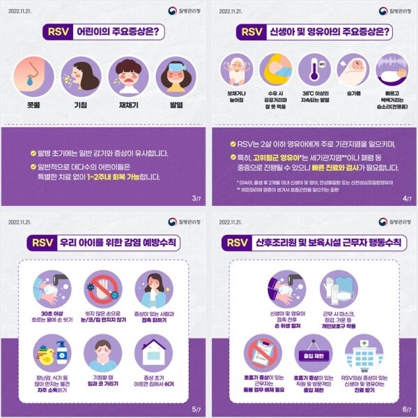 호흡기세포융합바이러스 감염증이란 매년 10월부터 다음해 3월까지 유행하는 급성호흡기감염증으로 감염된 사람의 호흡기 비말에 노출되거나 오염된 물건에 접촉 후 눈, 코, 입 주위 등을 만졌을 경우 전파된다.