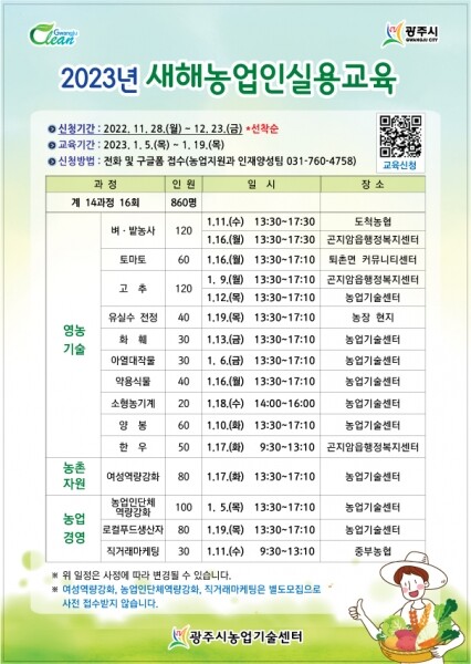 한정인 광주시 농업기술센터 소장은 “이번 교육을 통해 영농활동 계획과 영농현장 문제해결에 도움이 되길 바란다”며 “농업인들이 농정시책과 환경변화에 선도적으로 대응하고 소득증대로 이어지도록 최선을 다해 돕겠다”고 말했다.