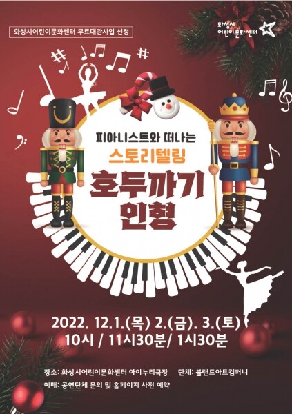 ‘피아니스트와 떠나는 스토리텔링 호두까기 인형’관람 신청은 오는 3일까지 ‘루돌프와 산타할아버지’는 12월 6일부터 화성시어린이문화센터 홈페이지에서 할 수 있다.