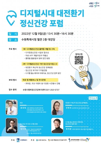 수원시 관계자는 “이번 포럼에서는 우리 사회의 정신건강 위기를 짚어보고 정신건강 관리·치료에 관한 구체적인 미래 비전을 논의한다”며 “디지털 정신건강 케어에 관심 있는 시민은 누구나 참여할 수 있다”고 말했다.
