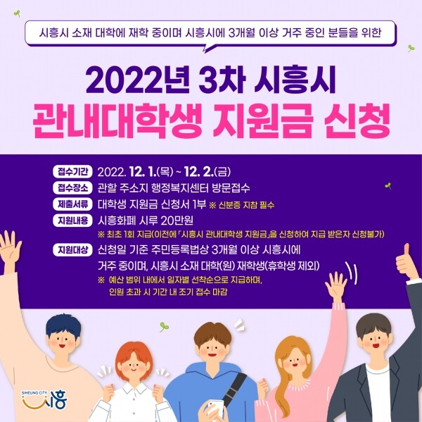 올해 시흥시 관내대학생 지원금은 상·하반기 총2회 신청·접수를 추진했으며 이번 3차 관내대학생 지원금 접수를 통해 2022년도의 관내대학생 지원금 신청·접수를 종료한다.