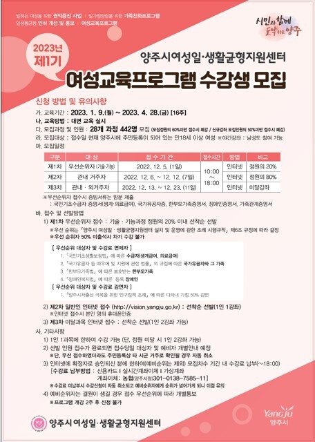 수강신청을 희망하는 시민은 양주시 여성일·생활균형지원센터 홈페이지를 통해 접수할 수 있으며 선착순으로 모집한다.