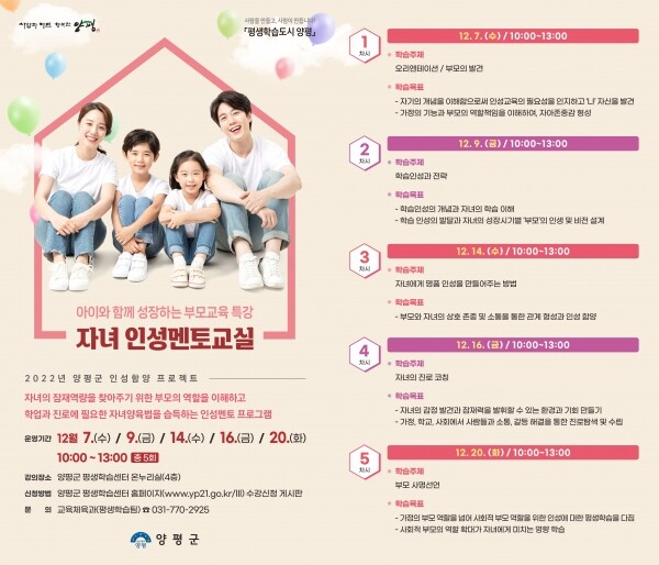 12월 7일부터 20일까지 총 5회차로 오전 10시부터 오후 1시까지 진행되며 12월 7일 오리엔테이션/부모의 발견 12월 9일 학습인성과 전략 12월 14일 자녀에게 명품 인성을 만들어주는 방법 12월 16일 자녀의 진로 코칭 12월 20일 부모 사 명선언의 주제로 진행된다.