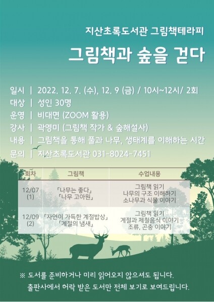 미리 그림책을 읽어 오지 않아도 수업 참여가 가능하고 강의는 12월 7일 수요일과 12월 9일 금요일 이틀간 오전 10시부터 약 2시간가량 진행된다.