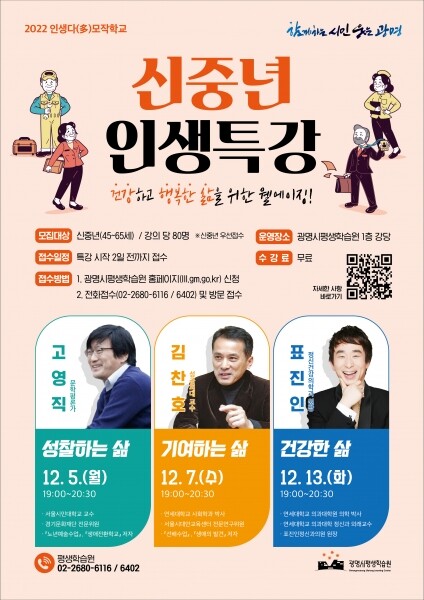 이번 특강은 광명시 평생학습원의 ‘인생다모작학교’ 사업의 하나로 12월 5일 고영직 문학평론가의 ‘성찰하는 삶’ 12월 7일 김찬호 성공회대 교수의 ‘기여하는 삶’ 12월 13일 표진인 정신건강의학과 원장의 ‘건강한 삶’ 등 3가지 소주제를 가지고 진행된다.