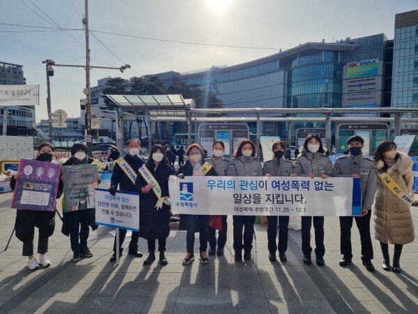 이날 캠페인에는 수원시 공직자, 수원중부·남부·서부경찰서 관계자, 가정폭력상담소 관계자 등이 참여해 시민들에게 여성폭력 신고 방법을 안내하고 홍보물품을 배부하며 “여성 폭력예방을 위해 함께 노력해 달라”고 당부했다.