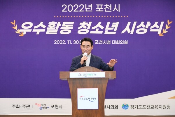 시상식은 ‘포천시 청소년 자치기구’ 우수활동 청소년 8명, 우수 동아리 2명, 우수 봉사자 1명과 ‘2022년 포천시 청소년정책제안 발표대회’에서 우수정책 제안으로 선정된 8팀 등 총 43명의 청소년에게 포천시장, 포천시의회 의장, 포천교육지원청 교육장 표창 및 상장을 수여했다.